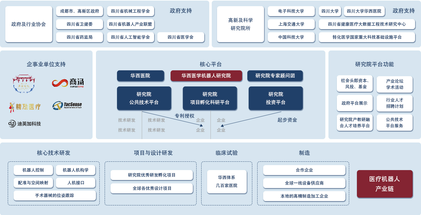 華西醫療機器人研究院是成都高新區“岷山行動”第一批揭榜項目,于20223月由成都高新區、四川大學華西醫院以及領軍科學家團隊共同出資成立,系集產學研為一體、以產業孵化為核心的新型綜合研發機構(工商注冊實體:華西精創醫療科技(成都)有限公司)。